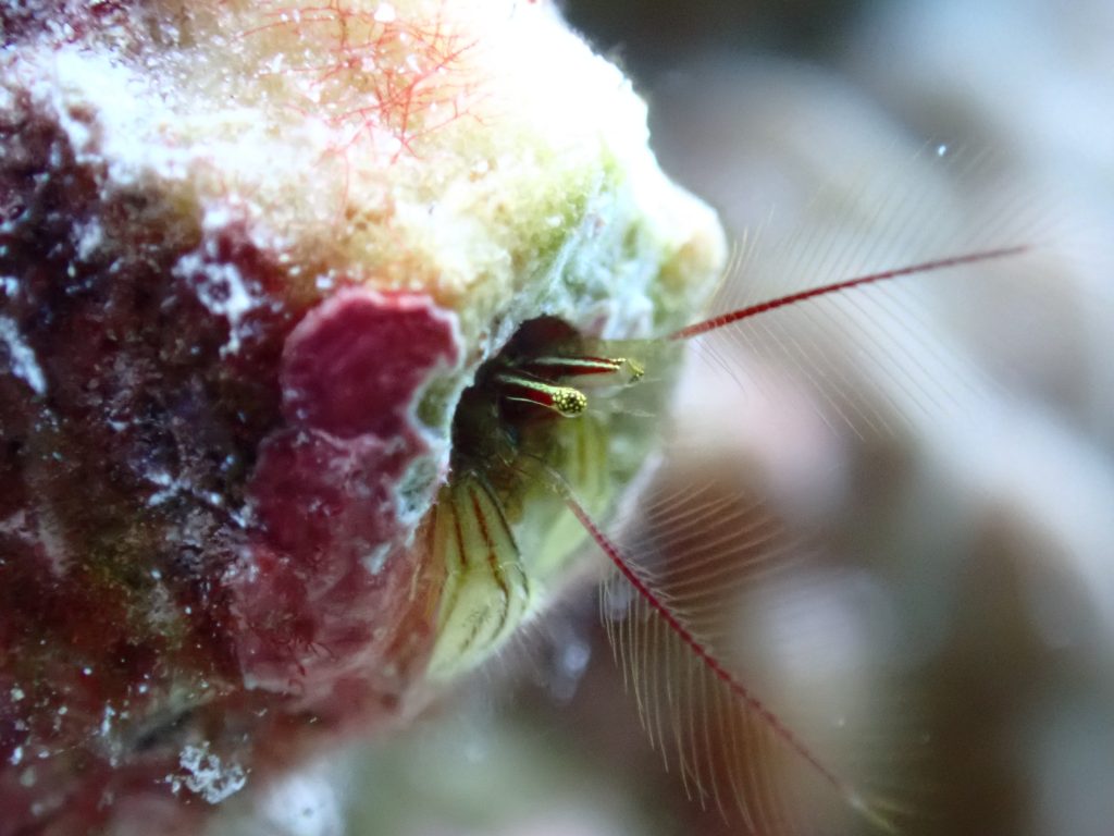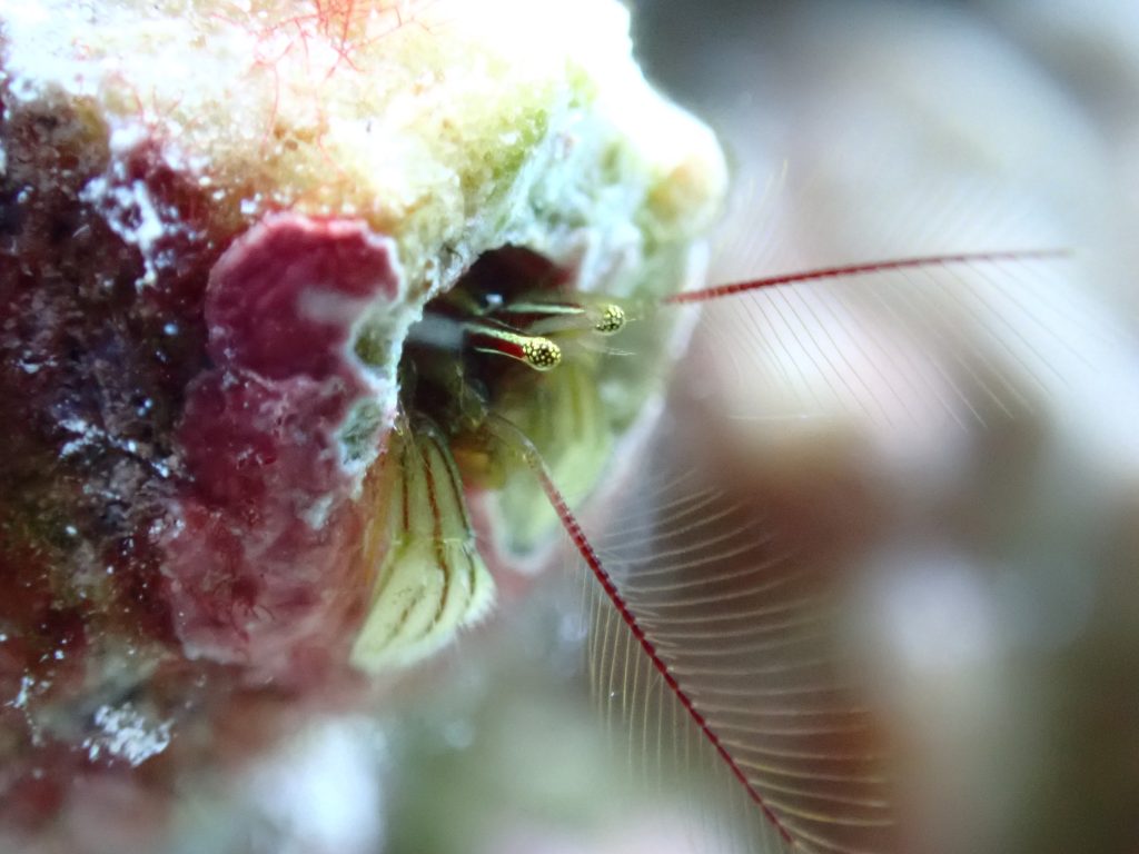 カンザシヤドカリの食事 2025年3月5日 maruyama 未分類 カンザシヤドカリの食事は、第2触手である、羽毛状の触手を振りながら浮遊物をキャッチして 食事をしています。小さいな生物なので脅かさない様に近づかないと、穴に引っ込みますからね。